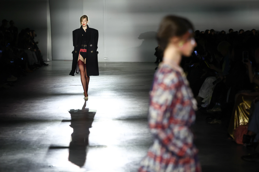 Piccioli used collars and cocoon backs to frame the figure rather than bury it. McQueen’s low-rise minis and neat boots pointed the same way.