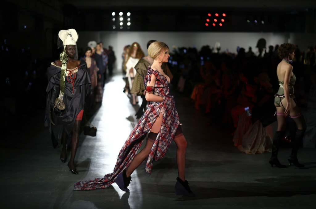 At Westwood, Andreas Kronthaler staged grief, eroticism and disorder at once, speaking openly about loss while insisting on pleasure and play. On the runway, that became rough seams, smudged lipstick, lingerie codes, odd hats and an unfinished bride. It looked messy, sad, sexy and alive.