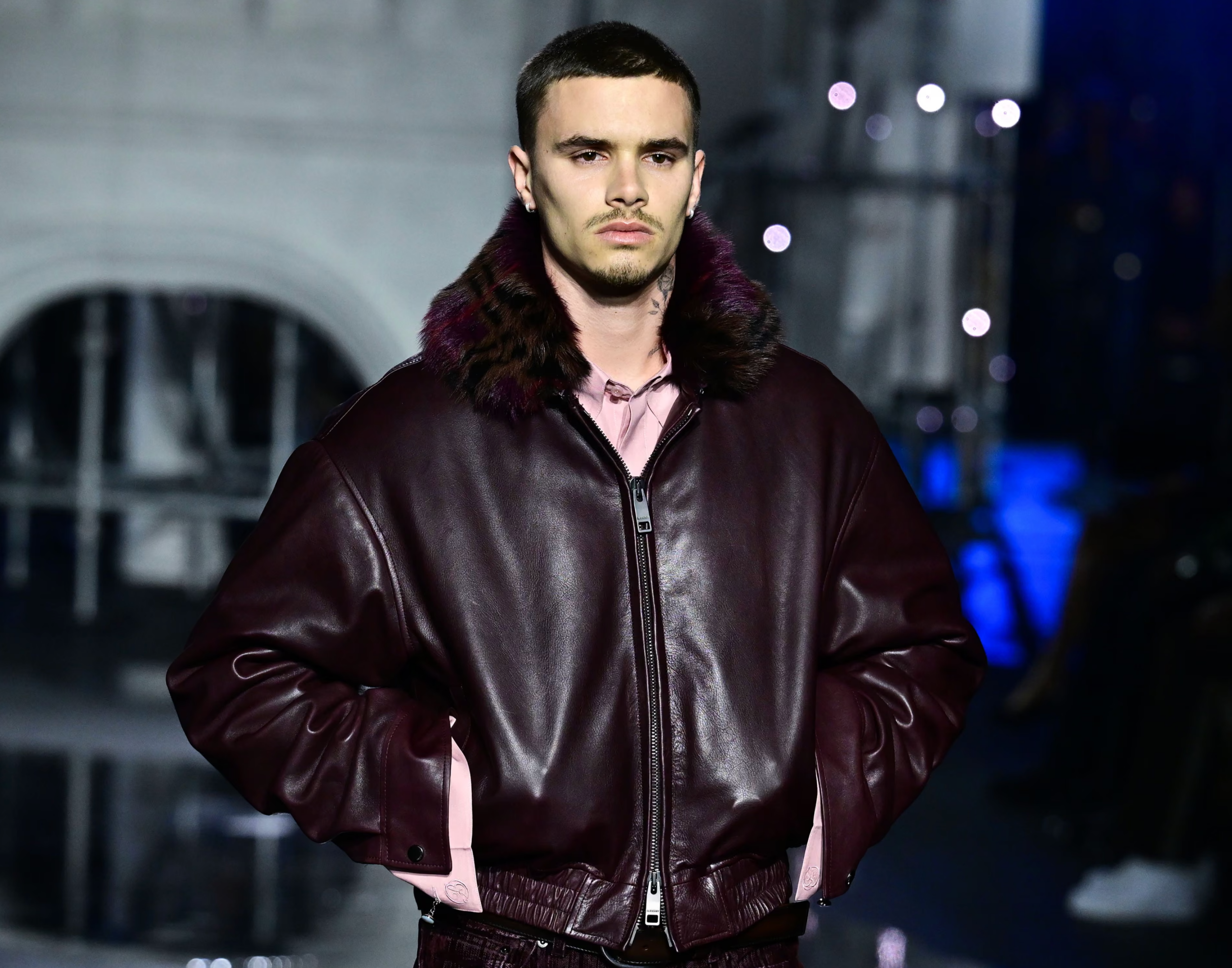 Last season Burberry was about muddy festival fields, before that it was country house weekends, but this night was all urban energy. Not just trenchcoats, but faux-fur bomber jackets and padded leather jackets, worn with stompy leather boots that could run for a night bus. The rest of us might be sick of rain, but Burberry leant into it, pockmarking the catwalk with slick puddles – made of non-slip resin, since the models walked in 6in heels.