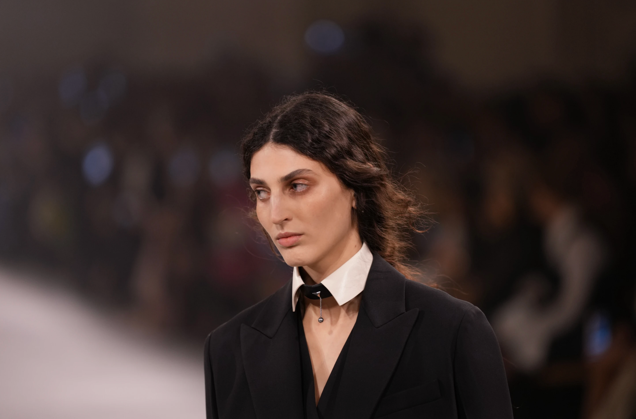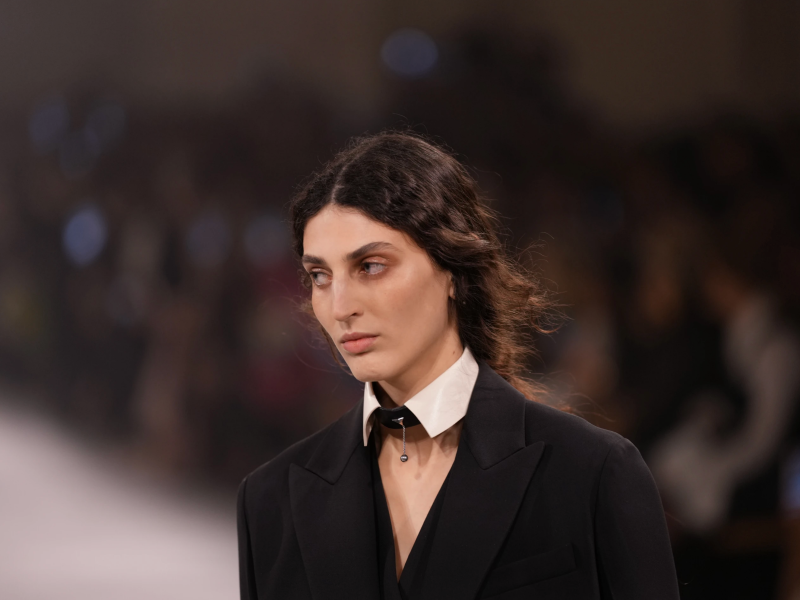 Dark blazers and overcoats defined the opening looks, layered over trousers, casual dresses and sheer lace. Lace was reinterpreted on laser-cut leather dresses, anchored by starched white collars and dainty bangles.