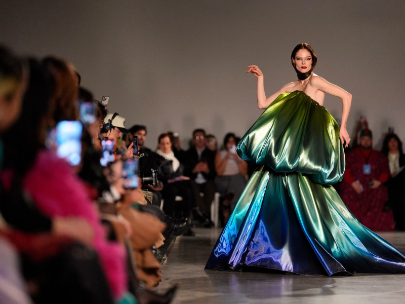 Siriano’s standout looks of the night featured pops of color including a chartreuse lace cropped jacket and maxi skirt, and the bright green ombre bubble gown that arrived shortly before his show.