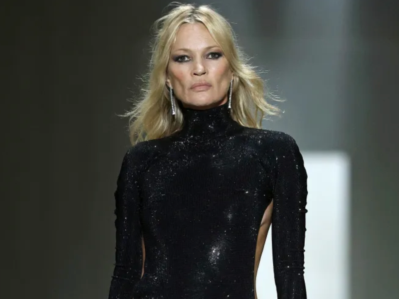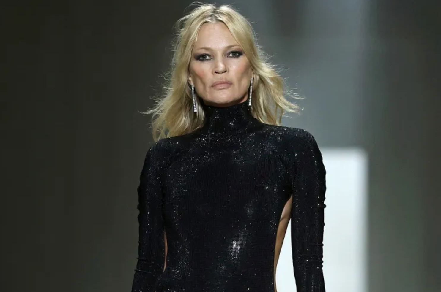 Kate Moss closed the show in a glittering evening gown that plunged in the back to reveal a double-G-branded thong. Moss moved sensually down the long, dark runway, soaking in the moment.