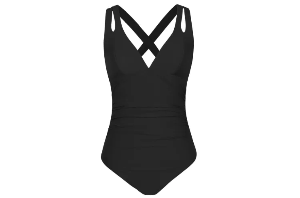 In addition to being chic and versatile, this one-piece swimsuit features a spandex blend and has subtle side ruching, which adds more shape and dimension to help smooth and sculpt. But the biggest selling point for me was the double shoulder straps and self-tying crisscross back. Considering I have a big chest, I need ample support. Not only do the double straps add extra security, but they also lift the girls up. The crisscross back is also great because I can customize the tightness of the top.