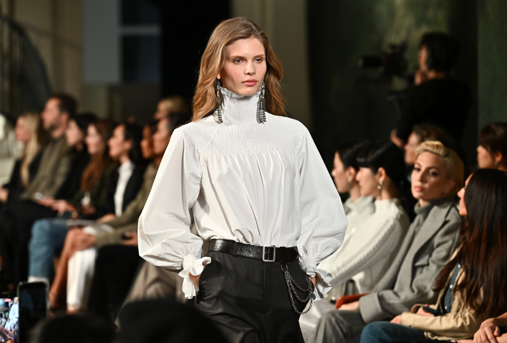 Supermodel Gigi Hadid opened the show in a wool corseted top and maxi skirt accentuated with a silver waist chain. Other models walked the runway with silver belt chains and metallic brooches that stood in an edgy contrast to Lauren’s romantic Victorian tops and tailored jackets. Lauren pinned metallic glimmering brooches to lush wool cloaks that were elegantly draped over models’ shoulders in a show of strength.