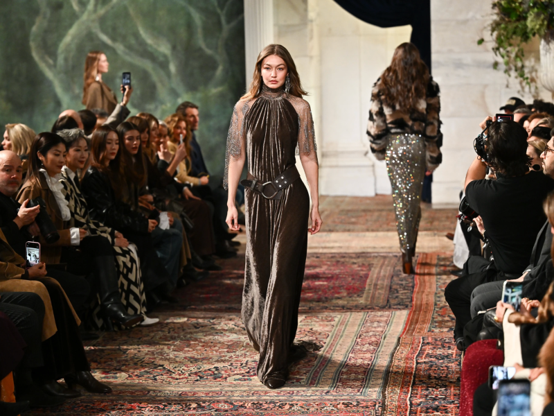Supermodel Gigi Hadid opened the show in a wool corseted top and maxi skirt accentuated with a silver waist chain. Other models walked the runway with silver belt chains and metallic brooches that stood in an edgy contrast to Lauren’s romantic Victorian tops and tailored jackets. Lauren pinned metallic glimmering brooches to lush wool cloaks that were elegantly draped over models’ shoulders in a show of strength.