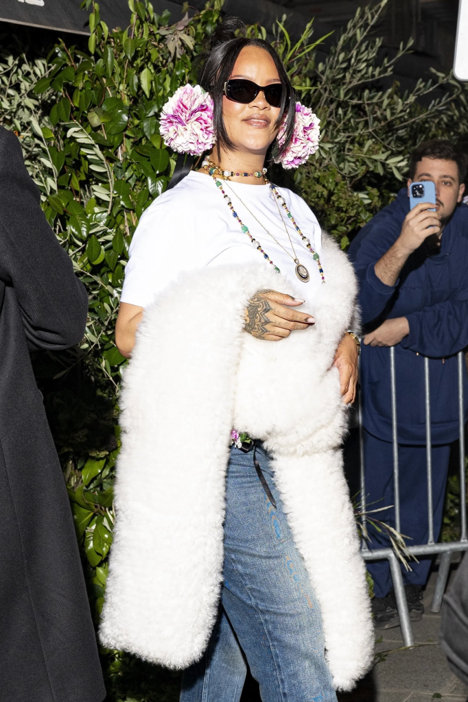 And oh, did Rihanna make it modern. She dressed down the high glamour look, pairing her posies with a white tee, cuffed blue jeans, and a furry white scarf. She accessorized with a pair of satin ballet slipper pink pointy-toe heels, layered necklaces, and sunglasses. And just peeking out from beneath her scarf, she tied another bunch of cyclamen around her belt loop.