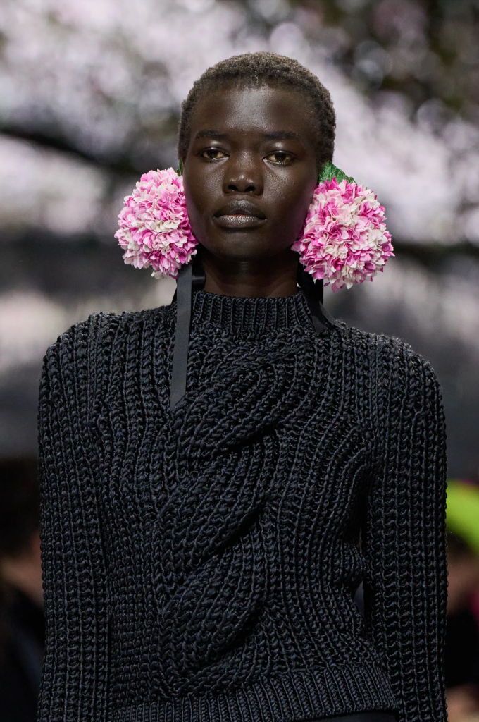 “To me, they almost look like those big headphones everybody is wearing now,” hairstylist Guido told Vogue backstage. “Flowers in the hair always signal romance, but the way they are presented, sitting at the front of the face, is what makes it modern.”