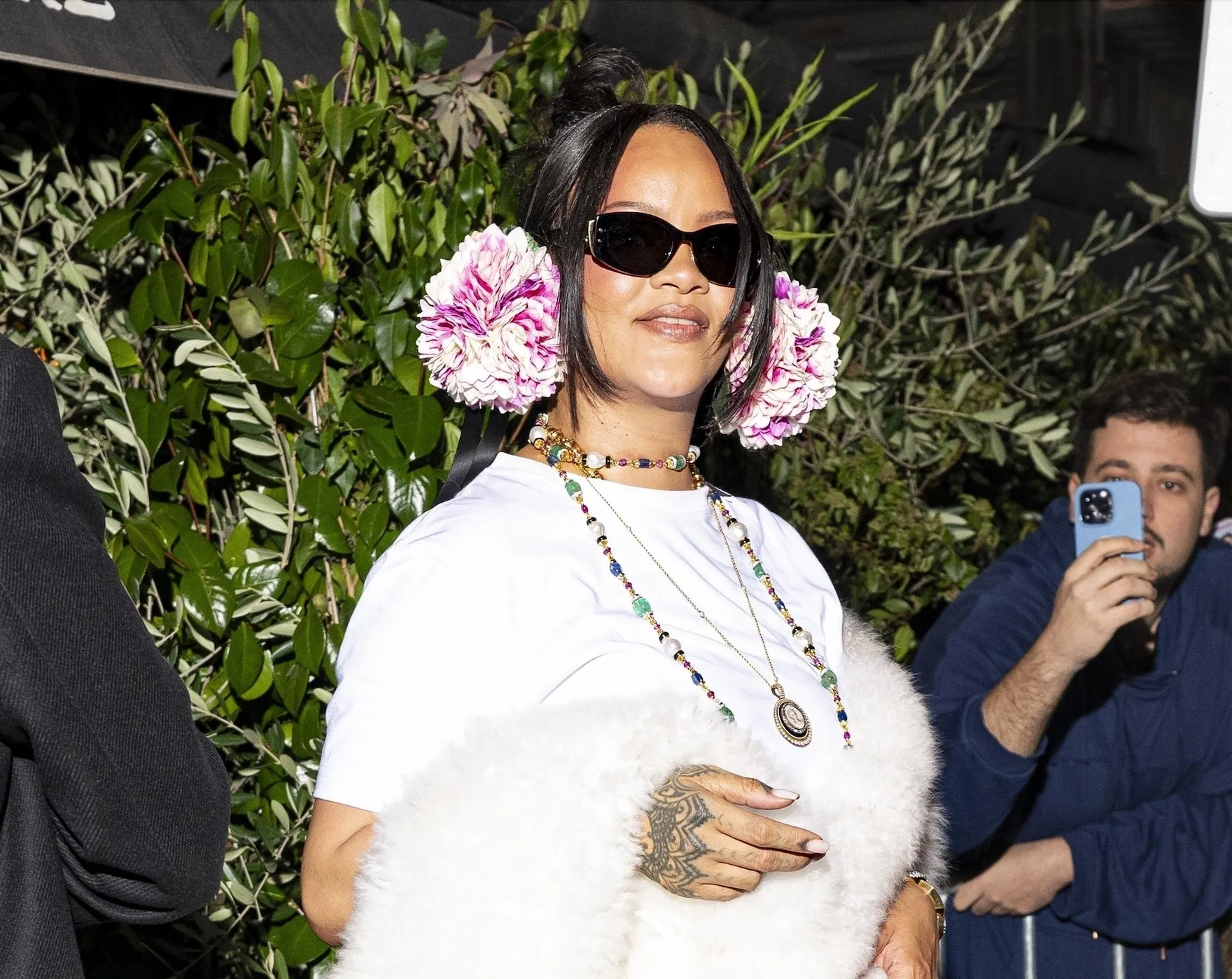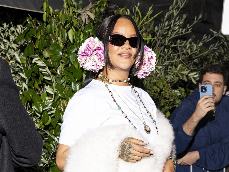 And oh, did Rihanna make it modern. She dressed down the high glamour look, pairing her posies with a white tee, cuffed blue jeans, and a furry white scarf. She accessorized with a pair of satin ballet slipper pink pointy-toe heels, layered necklaces, and sunglasses. And just peeking out from beneath her scarf, she tied another bunch of cyclamen around her belt loop.