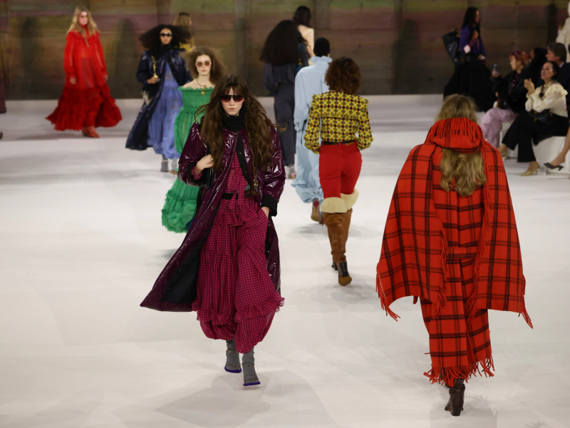 Piccioli used collars and cocoon backs to frame the figure rather than bury it. McQueen’s low-rise minis and neat boots pointed the same way.