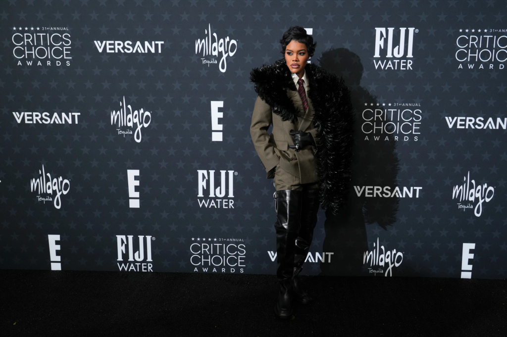 One Battle After Another nominee Teyana Taylor wore a full Saint Laurent by Anthony Vaccarello ‘fit — from the double-breasted jacket with feathers, shirt and trousers to her gloves, striped wide tie and over-the-knee boots. Tiffany & Co. jewelry made her shine even brighter.
